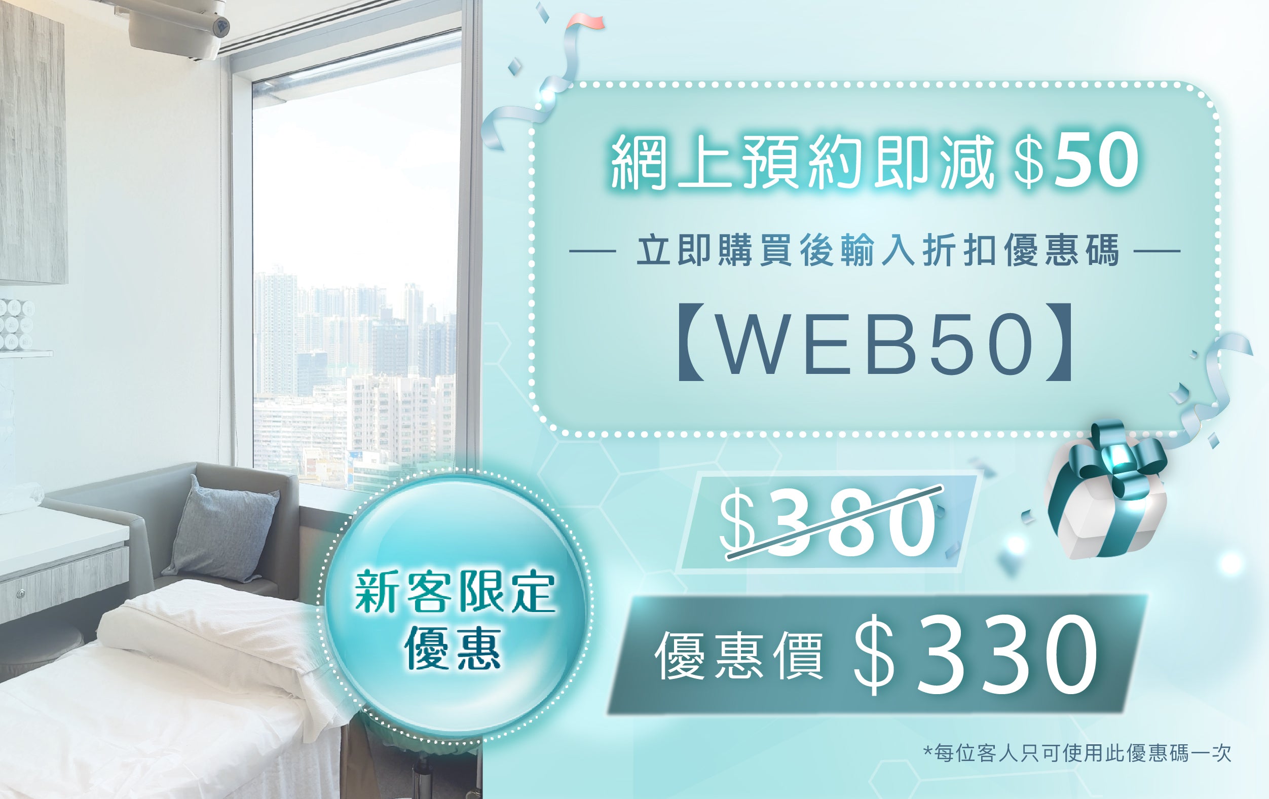 - 折扣優惠碼「WEB50」只適用於預約翌日後療程。