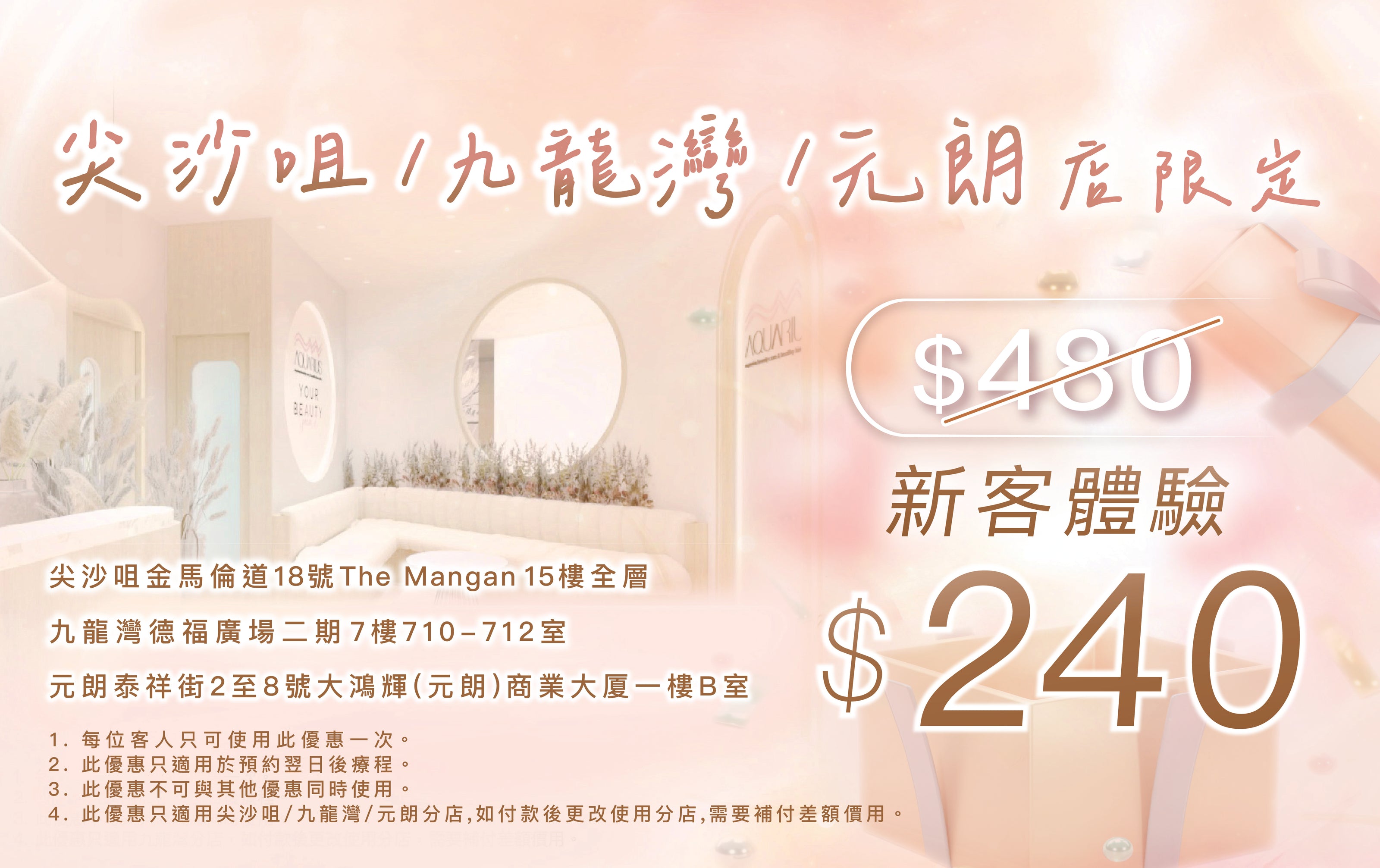 - 此優惠只限水瓶座美容健康纖體中心Aquarius Beauty 全新客戶首次體驗。