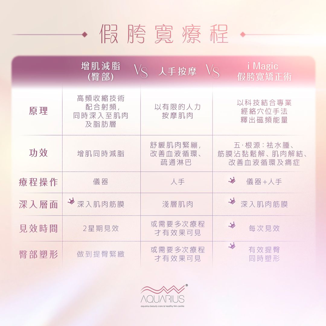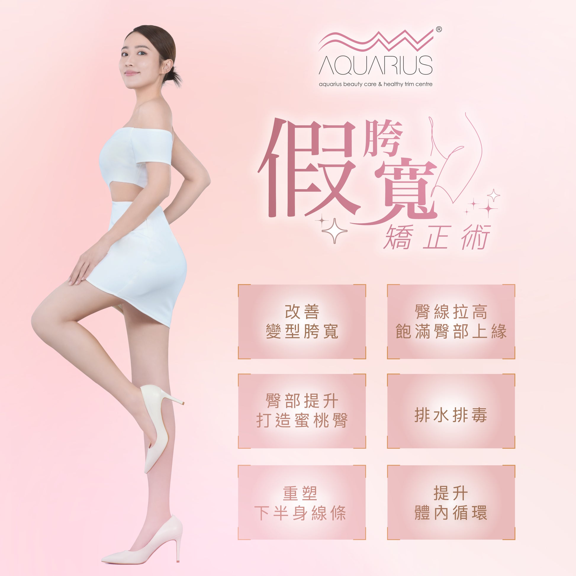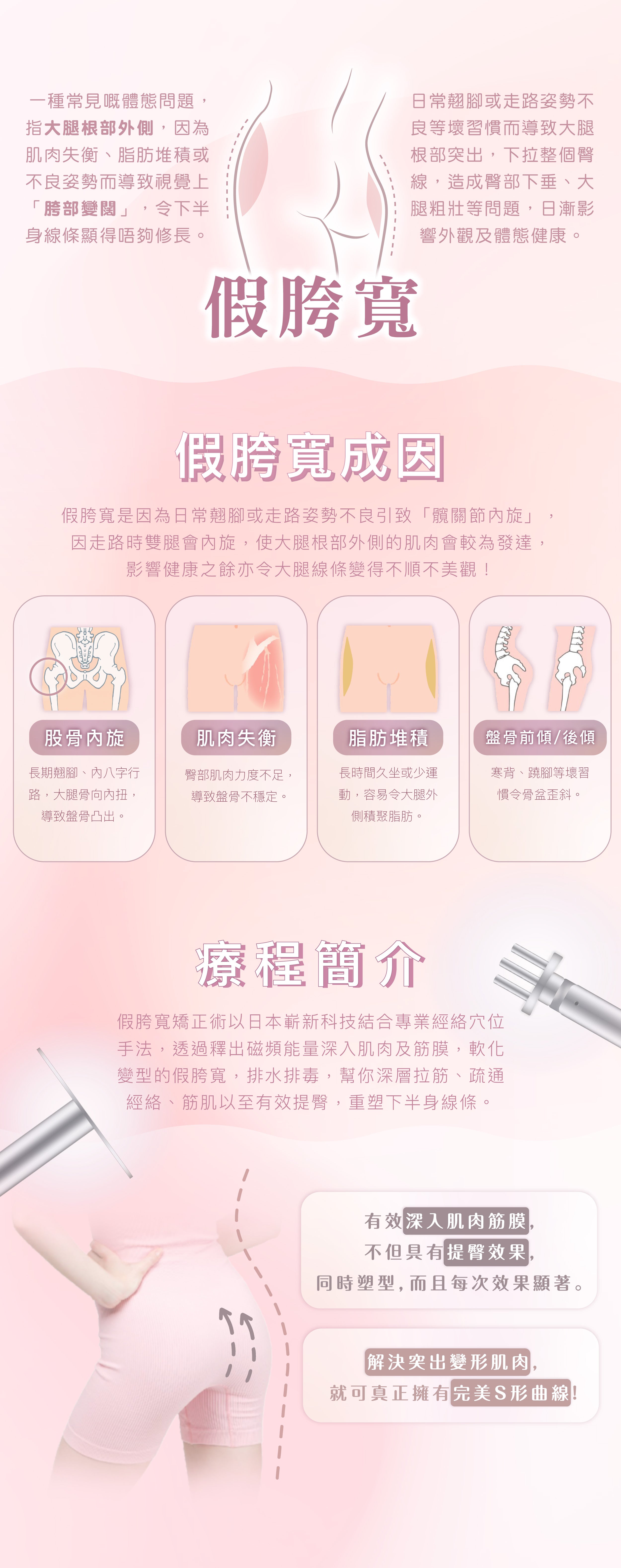 假胯寬矯正術以日本嶄新科技結合專業經絡穴位手法,透過釋出磁頻能量深入肌肉及筋膜,軟化變型的假胯寬,排水排毒,幫你深層拉筋、疏通經絡、筋肌以至有效提臀,重塑下半身線條。