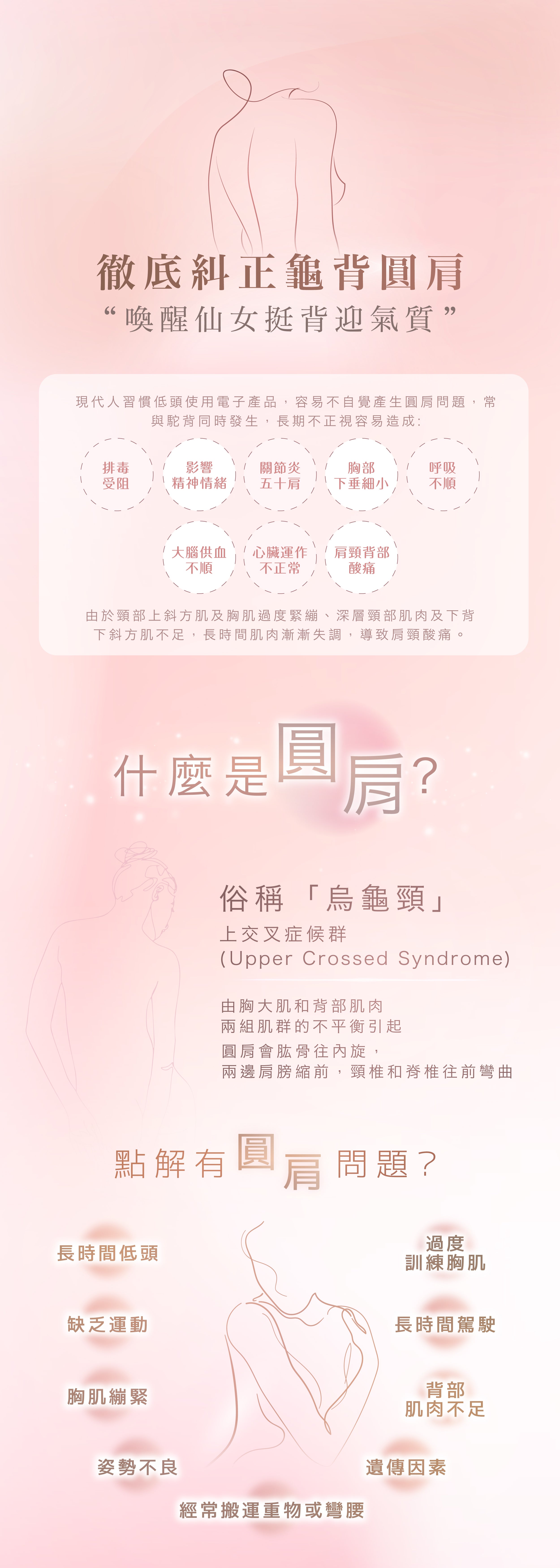 現代人習慣低頭使用電子產品,容易不自覺產生圓肩問題,常與駝背同時發生,長期不正視容易造成胸部下垂細小、肩頸背部酸痛、腹凸,甚至影響精神情緒、呼吸不順及排毒受阻。
