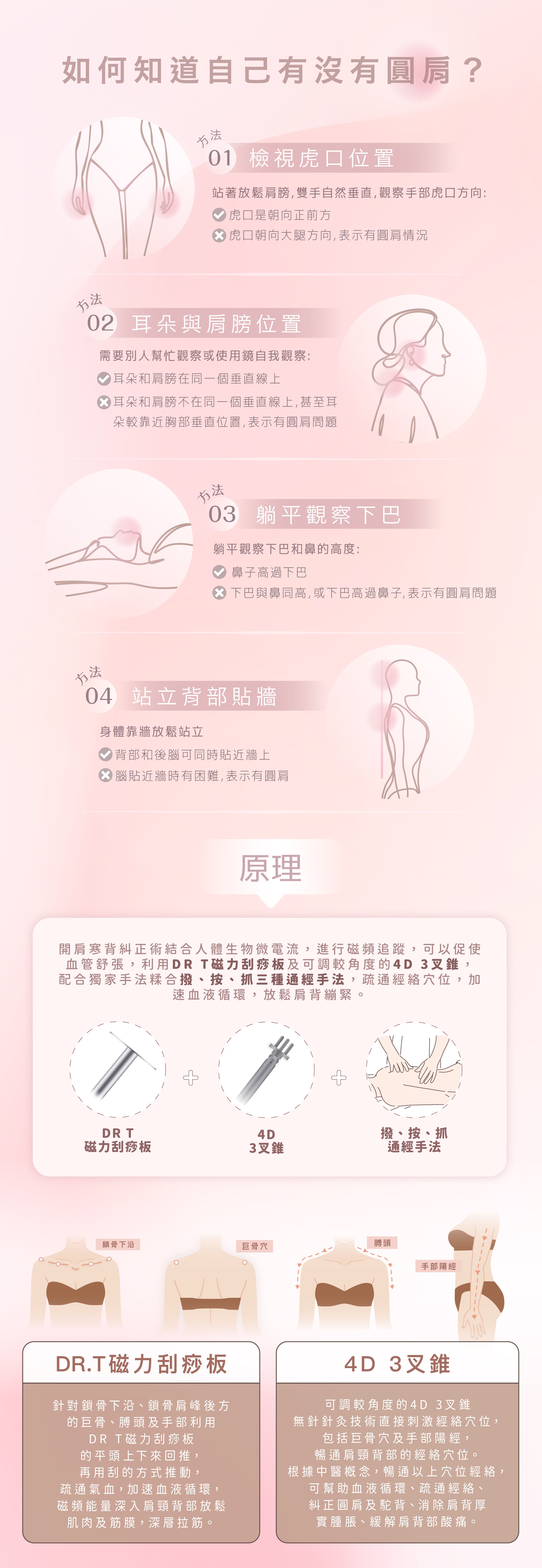 開肩寒背糾正術結合人體生物微電流,進行磁頻追蹤,可以促使血管舒張,利用DR T磁力刮痧板及可調較角度的4D 3叉錐,針對鎖骨下沿、鎖骨肩峰後方的巨骨、膊頭及手部,配合獨家手法糅合撥、按、抓三種通經手法,疏通經絡穴位,加速血液循環,放鬆肩背繃緊。